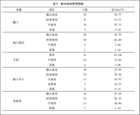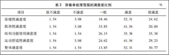 接下來作者從“保暖性滿意度”、“散熱性滿意度”、“結(jié)構(gòu)功能使用滿意度”、“運動舒適性滿意度”、“整體滿意度”五個方面對消費者滿意度進(jìn)行了調(diào)查。情況如下: