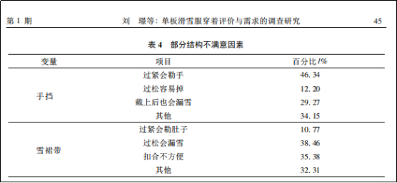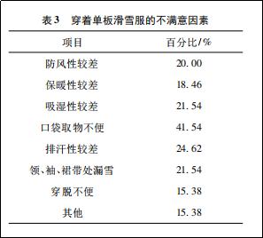 接下來作者又對消費者穿著單板滑雪服不滿意因素進(jìn)行調(diào)查,結(jié)果如下。