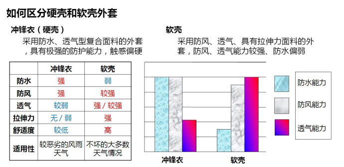 下面從一張圖區別硬殼軟殼沖鋒衣,簡單來說硬殼更加戶外專業,功能性更強,適合戶外活動穿;而軟殼是在原有保暖防風面料上增添一個防水層,功能性差一些,但同樣具備防水性能,適合日常交際穿著。