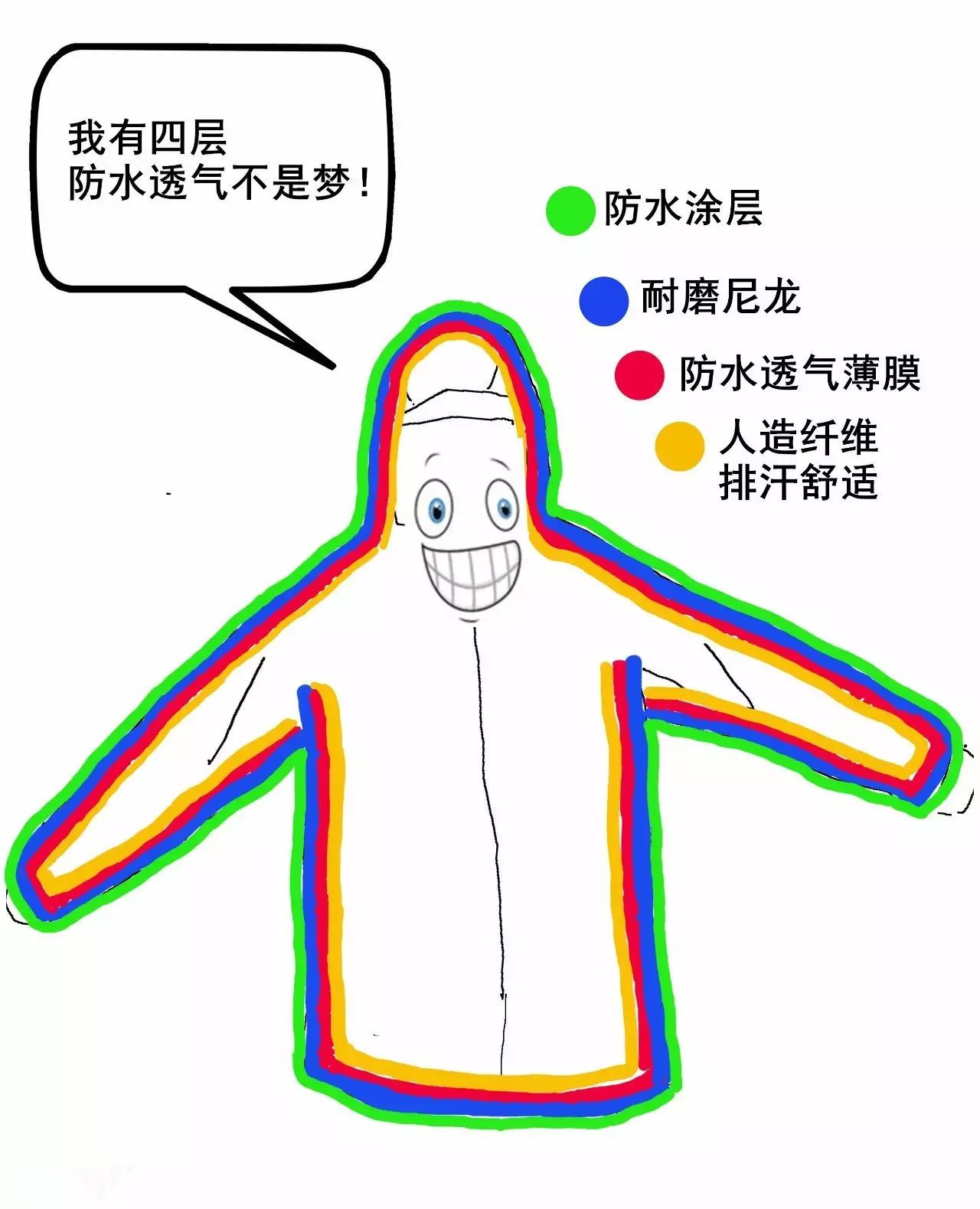 基于以上原理,現代沖鋒衣都是采用多層結構,涂層,尼龍,薄膜,人造纖維共同作用實現持續的防水透氣效果。
