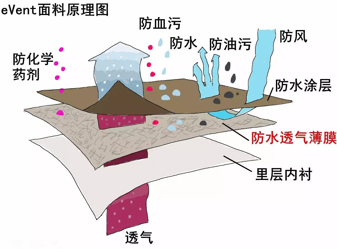 伊文特(eVent)面料起步于1999年,薄膜同樣采用ePTFE材料為基礎,防水透氣核心依靠的仍然是薄膜。