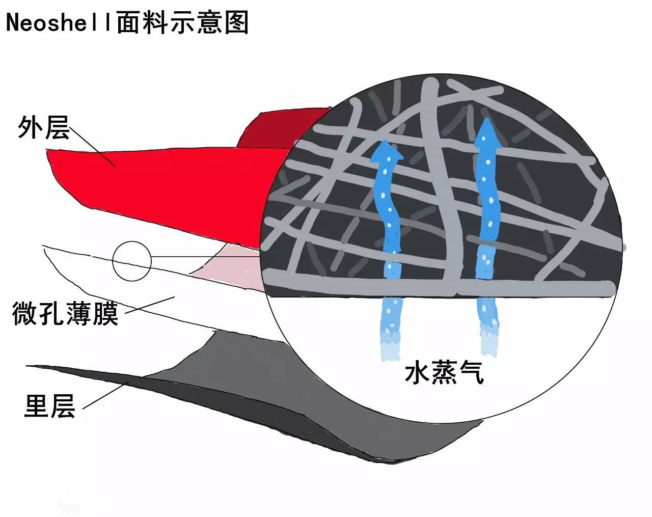 尼奧盾( Neoshell)面料由亞微米級別的纖維構成,屬微孔薄膜,也就是小孔更為細密,因此防水透氣效果更好。2011年由著名的抓絨面料公司保羅塔克(Polartec)研制。