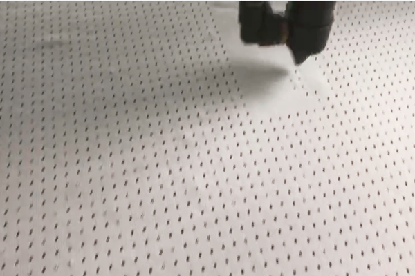 其實簡單來說鐳射就是激光,激光加工技術是利用激光束與物質相互作用的特性對材料進行切割、表面處理、打孔、微加工等,識別物體等的一門技術。而且呢鐳射光束具有高亮度、高方向性、高單色性和高相干性四大特性,所以就給鐳射加工帶來一些其它加工方法所不具備的特性。又由于它是無接觸加工,對材料無直接沖擊,沒有機械變形;在鐳射加工過程中也無“刀具”磨損,無“切削力”,那您定制的沖鋒衣就能保持切割表面光潔美觀了;其次鐳射加工過程中,鐳射光束能量密度高,加工速度快,并且是局部加工,對非鐳射照射部位沒有影響或影響力極小。但是有的沖鋒衣的制作用鐳射機穿孔一個工序就要花上一個半多小時,可以看看下面的圖片,而且我們為了保證沖鋒衣的質量以免出錯還要專門派人看著,所以說一件沖鋒衣的制作工藝不簡單!