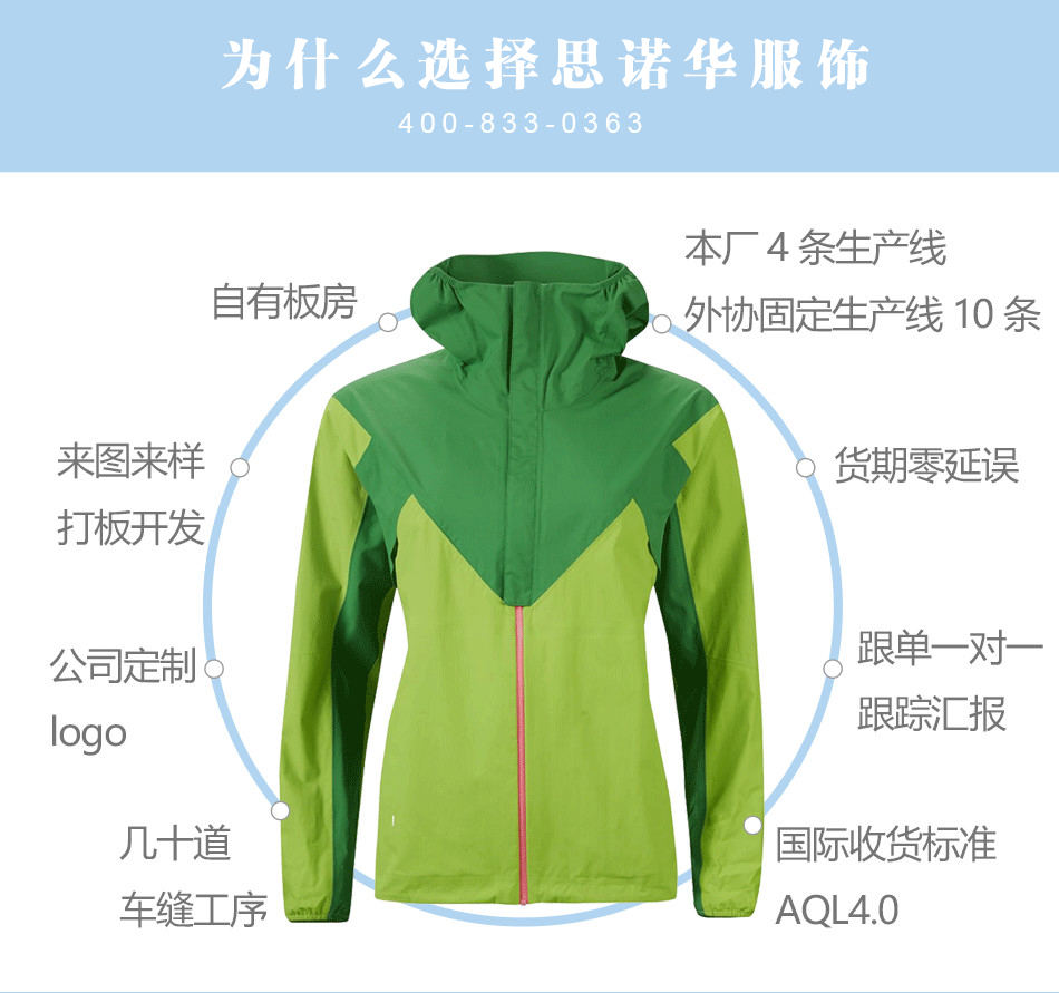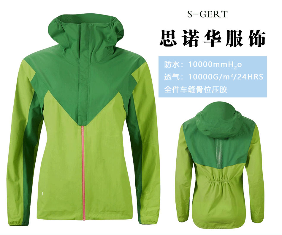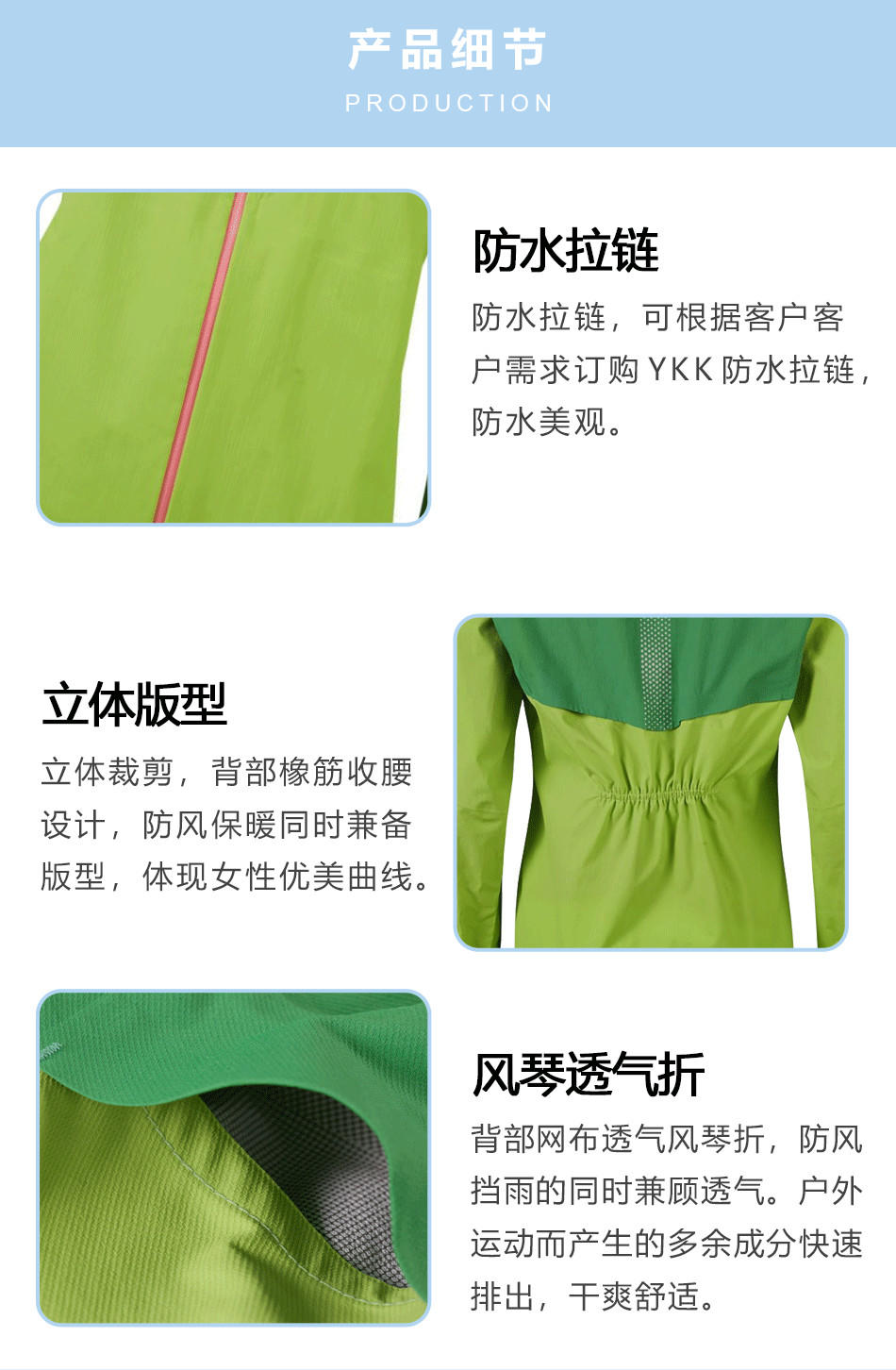 立體版型:后背收腰設計,立體裁剪,防風保暖同時兼備版型,體現女性優美曲線,專業單層壓膠衣定制。