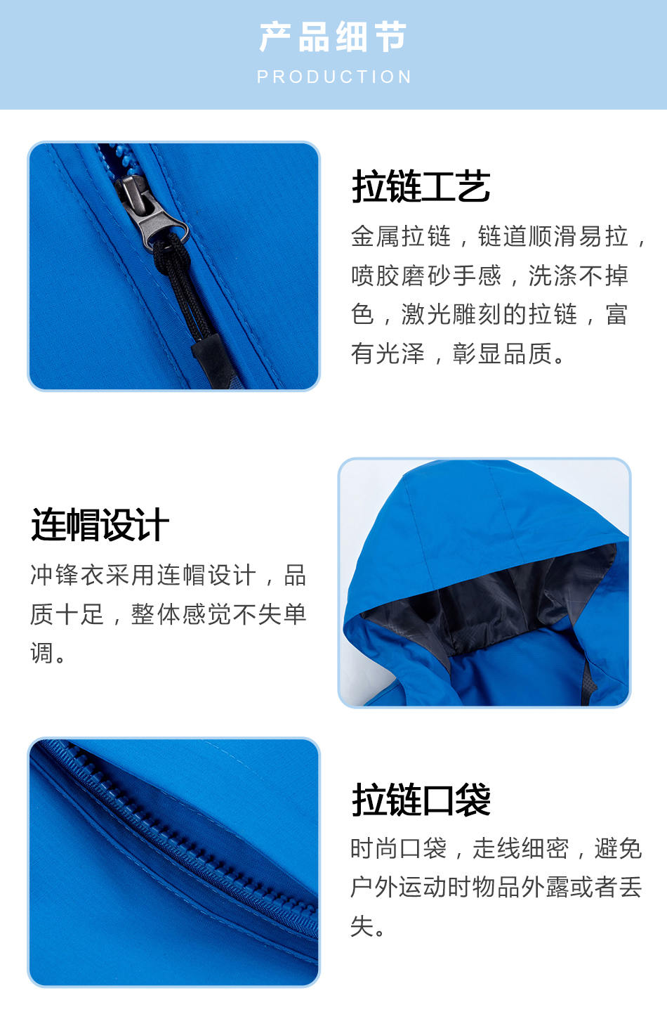連帽設計:運動服沖鋒衣定制采用連帽設計,品質十足,整體感覺不失單調。
