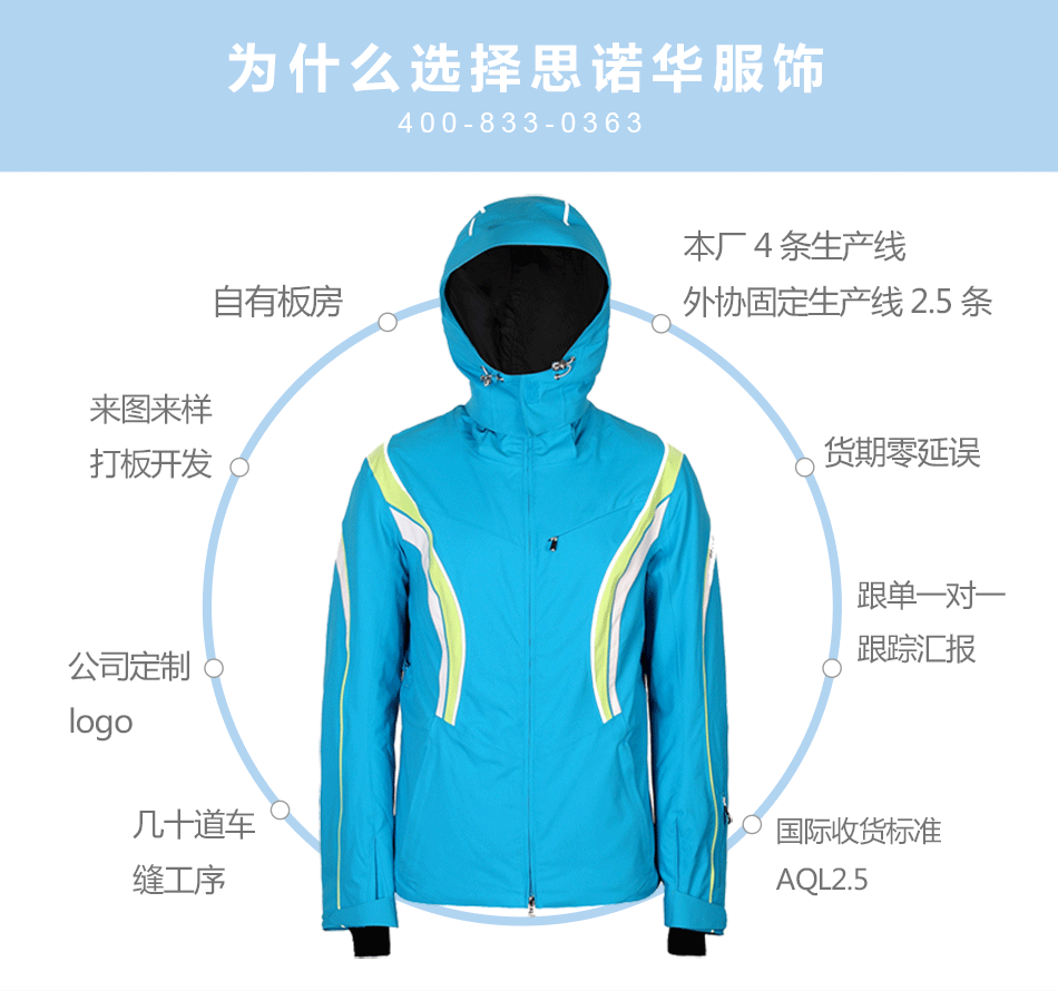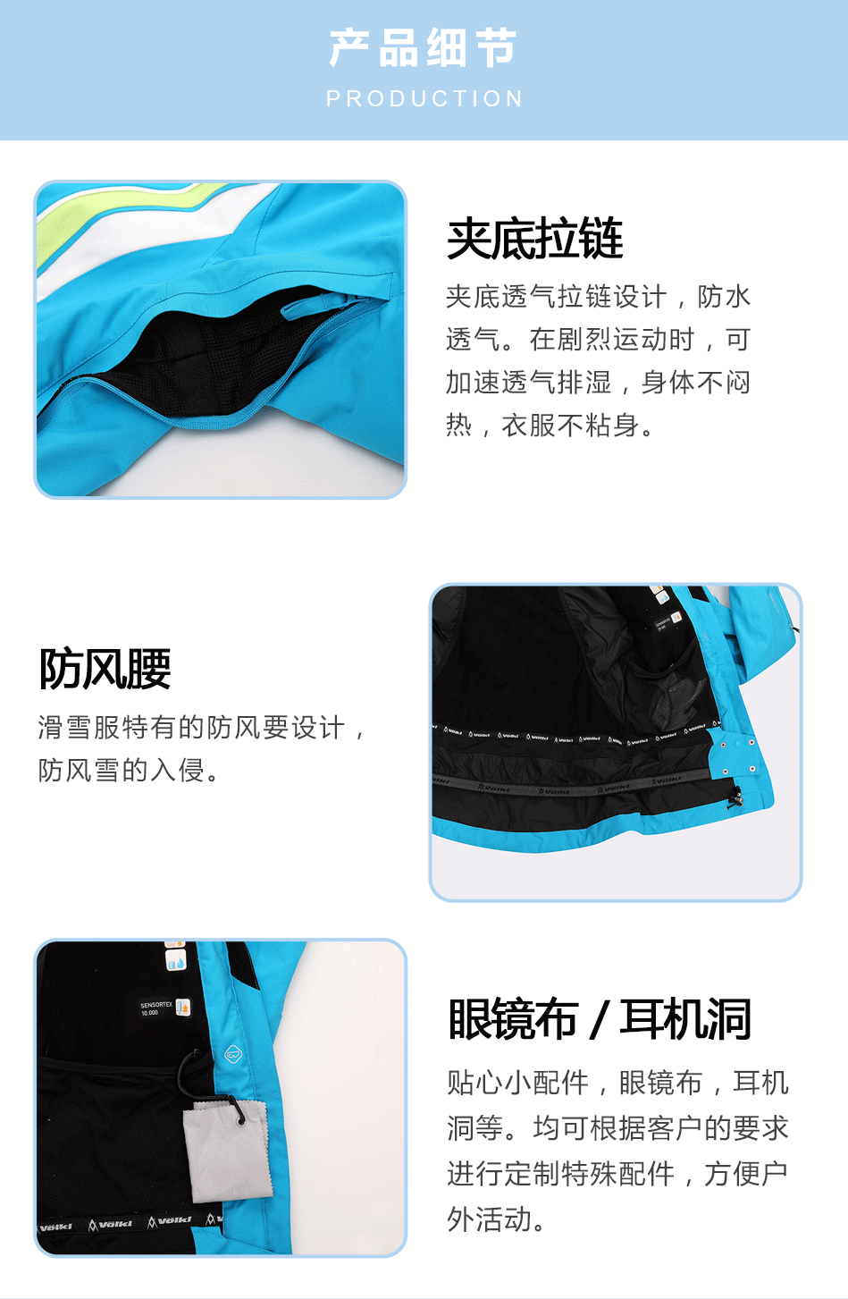 防水拉鏈采用無縫壓膠防水拉鏈激光熱封工藝貼合,面料采用進口防水透氣涂層膜,使防水透氣膜與面料完美結合。可根據客戶需求生產加工沖鋒衣。