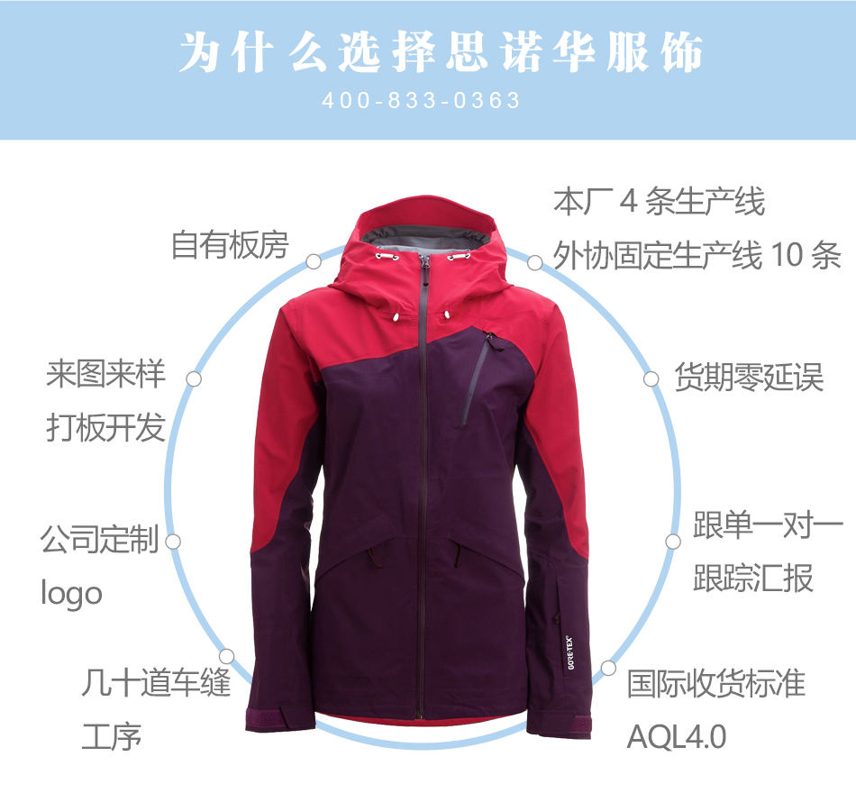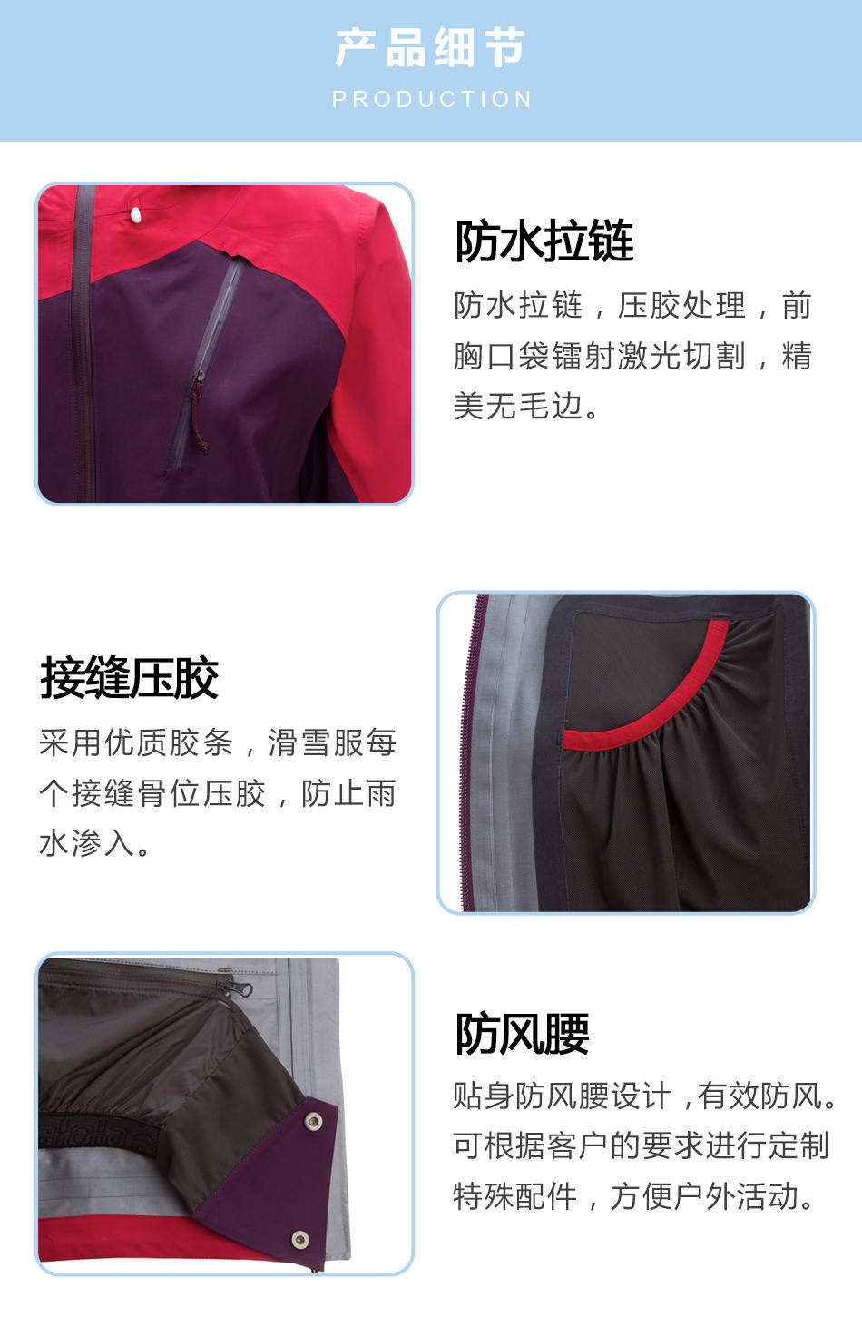 接縫壓膠:壓膠滑雪服生產采用優質膠條,滑雪服每個接縫骨位壓膠,防止雨水滲入。